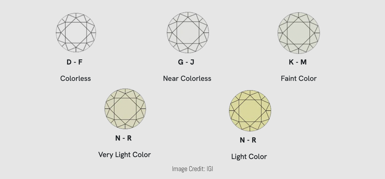 G - J are near colourless and when set in jewelry the light traces of colour will not be visible to the untrained eye since the colour is only visible when viewed face down against a white background.